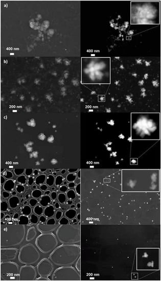 In addition, high-resolution FE-SEM images of PP@AgNP suspensions, acquired in both direct (left) and back-scattered (right) configurations, are shown in Figure 2 for PP@AgNPs-1, PP@AgNPs-2, PP@AgNPs-3, PP@AgNPs-6 and PP@AgNPs-7. As the comparison between the UV-Vis-NIR spectra of the samples PP@AgNPs-4 and PP@AgNPs-5 allows overlapping to sample PP@AgNPs-3, only the latter sample has been further characterized with high-resolution FE-SEM. The morphological parameters extracted from the images are listed in Table 2.