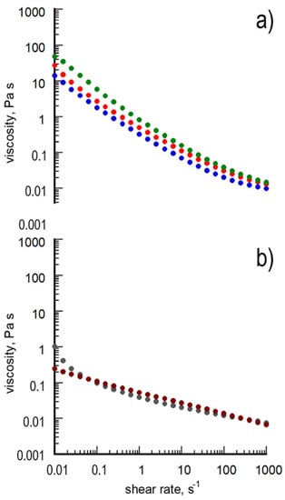 Curves of viscosity obtained from samples. From top to bottom: (a) PP@AgNPs-1 (blue full circles), PP@AgNPs-2 (red full circles) and PP@AgNPs-3 (green full circles); (b) PP@AgNPs-6 (gray full circles) and PP@AgNPs-7 (brown full circles).
