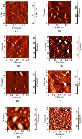 Atomic force microscopy (AFM) images of the PP@NP samples: (a) Orgacon (RMS = 1.2 nm); (b) PP@AgNPs-1 (RMS = 33 nm); (c) PP@AgNPs-2 (RMS = 4.3 nm); (d) PP@AgNPs-3 (RMS = 5.3 nm); (e) PP@AgNPs-4 (RMS = 7.7 nm); (f) PP@AgNPs-5 (RMS = 4.4 nm); (g) PP@AgNPs-07 (RMS = 8.1 nm); (h) PP@AgNPs-6 (RMS = 1.3 nm).