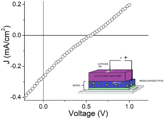 As a proof of concept to demonstrate the potentialities of PP@AgNPs, a preliminary polymer solar cell was fabricated using the PEDOT:PSS/AgNP layer as the anode, and its performance was compared with devices with the same active layer and the classic ITO anode. As discussed previously, the first PEDOT:PSS layer is required for a continuous and smooth deposit of the next nanoparticle-based layer. Among all the nanoparticles synthesized, the PP@AgNP-6 sample was chosen because of (i) its high morphological quality in that the RMS roughness is minimized compared to all the other cases; (ii) the UV-Vis-NIR features in which the polaron band of PEDOT:PSS is still observable, revealing the absence of doping losses or conformational changes that could affect the electrical conductivity; (iii) in the PP@AgNP-6 sample, the AgNPs are expected to be formed outside the conductive domains of PEDOT and then to act as electrical bridges between one domain and another, as mentioned in previous works [26,27]; (iv) from preliminary electrical sheet resistance measurements with the four-probe method, PP@AgNPs-6 results to have a sheet resistance (ohm/cm2) sensibly lower than the other samples (i.e., <103 ohm/cm2 for PP@AgNPs-6 against values above 104 ohm/cm2 for all the other samples), probably due to the higher morphological homogeneity and flatness of PP@AgNPs-6 compared to the other samples.