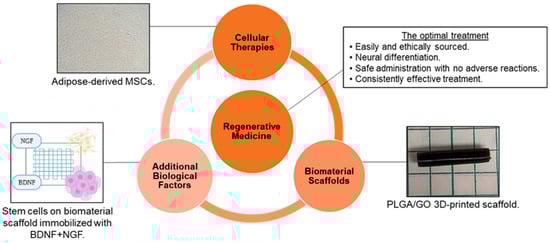 As a result of the limited ability of peripheral nerves to regenerate without assistance and the lack of availability of efficient therapies for nerve repair, tissue engineering and regenerative medicine have become promising areas of study to develop novel, effective treatments. The goal of tissue engineering and regenerative medicine is to use exogenous cells, biomaterials, and/or additional biological factors to promote a more favorable microenvironment after an injury or disease so that the tissue can be repaired, and function restored. Although reaching this goal is complicated by the intricacies of the nervous system, optimal treatment for neural applications would be: (1) tissues obtained from a source that is easy and ethical to access; (2) therapeutic materials that can promote differentiation into specific neural and glial cell types; (3) a method of administration that is safe, minimally invasive, and causes no short-term or long-term adverse effects; and (4) an effective treatment that fully and consistently restores function [15,20,21] (Figure 1). To achieve this goal and optimize the scaffold design, consideration of the biomaterial–cell interactions and the constructs’ influence on cell behavior is required. This review will evaluate the natural and synthetic polymers that form the construct, as well as the fabrication methods that modify the material properties that influence cell behavior. This review will also evaluate the methods to measure cell response in vitro and in vivo, and the endogenous and exogenous cell types that will interact with the developed construct.