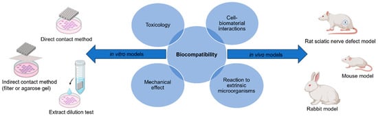 Biocompatibility can be evaluated using the appropriate in vitro and in vivo models to ensure there is no toxicology, mechanical effects, reaction to extrinsic microorganisms, or cell–biomaterial interactions [figure made with BioRender and Microsoft PowerPoint].