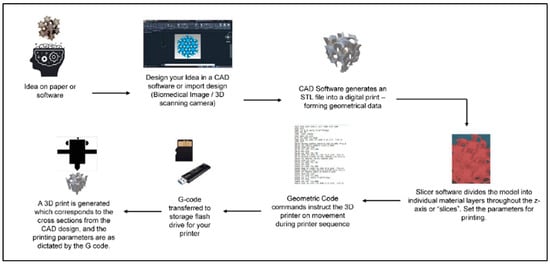 General schematic of the computer-aided 3DP process. Figure adapted from [95]. The use of this figure is governed by the Creative Commons Attribution (CC BY license https://creativecommons.org/licenses/by/4.0/) to the licensee MDPI, Basel, Switzerland.