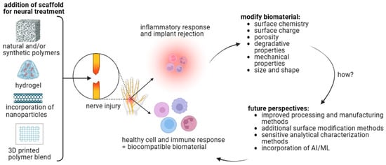 Biomaterial–cell interactions influence biocompatibility. Polymer choice, fabrication method, and additional modifications can alter the biomaterials’ physical and chemical properties. These properties affect cell behavior to determine local and systemic immune responses. Future perspectives should be considered to develop a therapeutic treatment for neural injuries [figure made with BioRender].