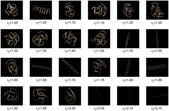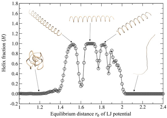 Furthermore, we have also investigated the structures of the trajectories at other equilibrium distances of the LJ potentials, including = 1.69, 1.82, and 2.25. Similar to the case for = 1.52 (Supplementary Figure S2), the models also exhibit a helix–globule–coil transition for the cases of = 1.69 (Supplementary Figure S3) and = 1.82 (Supplementary Figure S4). However, for the case of = 2.25 (Supplementary Figure S5), the model only exhibits an extended-string–random-coil transition, as expected.