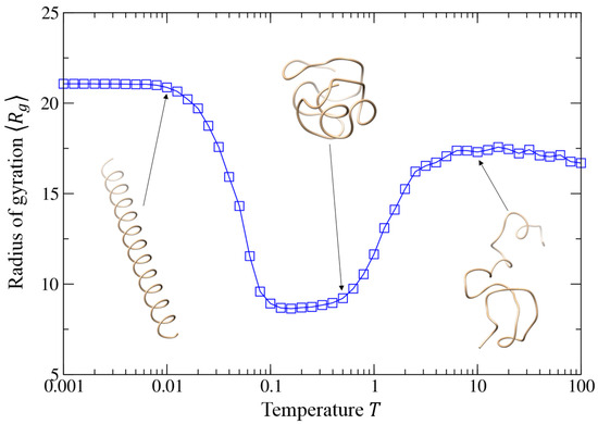 Figure 7 shows the average root-mean-square radius of gyration of the trajectory generated by our model as a function of temperature T when the equilibrium distance = 1.52. It can be seen from the figure that the average radius of gyration shows a reentrant shape with the temperature decreasing, indicating two phase transitions of the system during the process. One transition occurs around T = 1.25 where reduces rapidly from about 16 to around 9 for the system of size N = 51. The stays around the value for a range of temperatures until a second transition happens at temperature T ≈ 0.05 where the jumps from around 9 up to above 20. A dramatic change of the radius of gyration is an indication of a phase transition in the system. The corresponding transitions can also be confirmed by the structural change of the trajectories at different temperatures shown (Supplementary Figure S2).