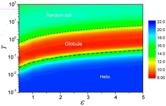 A schematic phase diagram of the system in the T − ε space when for a fixed r0 = 1.52. The system size is N = 51. The diagram is colored from red to blue based on the radius of gyration . The dotted and dashed lines stand for the plots of Equation (7) with λ = 1.25 and 0.05, respectively.