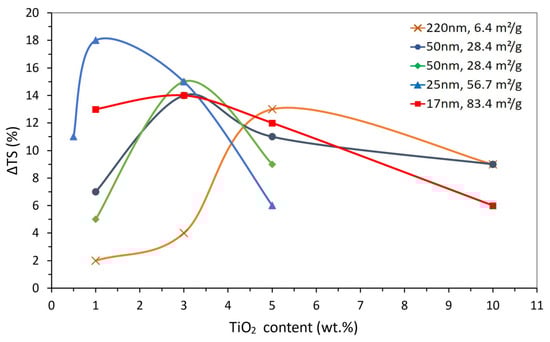 Figure 1 shows that, regardless of the TiO2 content and SSA, the composite’s TS was always higher than that of the corresponding epoxy matrix. As a common trend, Figure 1 also shows that there is an optimal particle content that results in a maximum TS gain. Above the optimal content value, the TS gain drops, apparently due to ineffective particle dispersion: the higher the TiO2 content, the harder it is to avoid particle agglomeration. More importantly, it appears that the optimal particle content tends to decrease as the corresponding SSA increases, i.e., higher TS gains might be obtained with lower contents of smaller particles (high SSA).