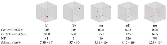 Figure 2 was constructed using the commercial software Digimat® (Version 2021-3 by Hexagon) and the Random Fiber Placement algorithm (the algorithm places the particles at random positions within the cube until the specified volumetric fraction is reached), illustrates the crowding of 0.05 wt.% TiO2 particles in a 10 × 10 × 10 µm3 volume as a function of the particle size. As the particle diameter is halved, the SSA duplicates (from Equation (1)); however, NP increases sharply (multiplies by 23). As seen in Figure 2, the same small weight content of well-dispersed TiO2 particles could result in a homogeneous composite with properties that improve when the particle size decreases (i.e., SSA increases). However, Figure 2 clearly shows that downsizing can result in an excessive number of particles, whose crowding will bring about dispersion difficulties (e.g., agglomeration) and consequently, hindered properties.