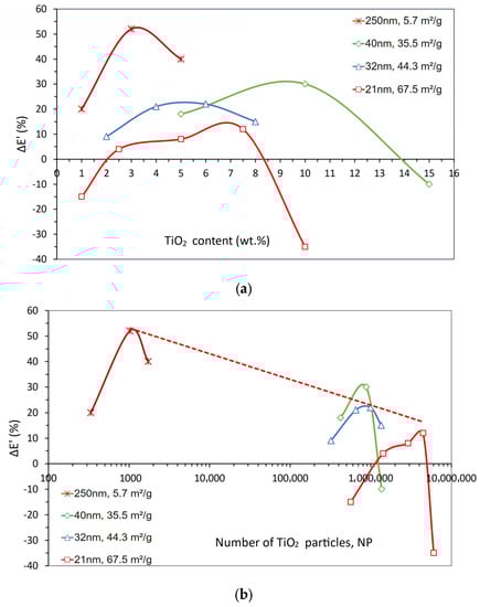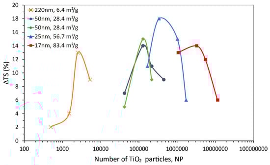 Figure 4 allows a clearer analysis of the effect of TiO2 particles on epoxy compared to that shown in Figure 1. The dependency of the tensile strength variation with the particle number enables a distinct separation of the ΔTS maxima and brings to evidence the influence of the surface area (i.e., particle size and content), which was not apparent in Figure 1.