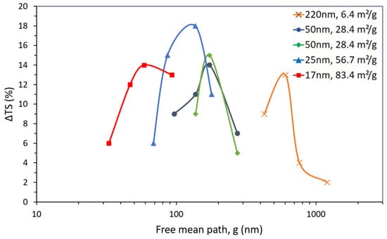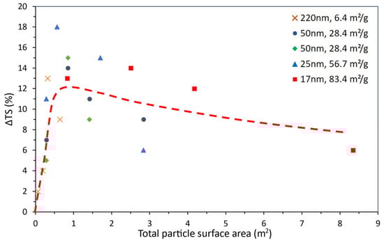 The first point worth mentioning is that when the property is plotted as a function of NP, a better overlap can be seen for the two 28.4 m2/g curves, despite the particular processing parameters considered in each study [,], which the previous and traditional form of portraying data (in wt.%, as seen in Figure 1) did not show. Although the maximum on the property curves was seen before, the representation in Figure 4 clearly separates such maxima, bringing to evidence their dependence on the specific surface area. In other words, for comparatively large particles (i.e., low SSA), the number of particles required to reach the maximum is low; as the particles are downsized (i.e., increasing SSA), the NP for the maximum also increases. Moreover, Figure 4 shows that the maxima on ΔTS are clearly higher for the lower particle sizes while suggesting that there might be an optimal particle size (or SSA) for the maximum property gain, as envisioned earlier in Figure 1. When Figure 1 and Figure 4 are analyzed together, as the particle size decreases, the weight content needed for the maximum property gain also decreases; however, the number of particles increases, i.e., the maxima move backwards in Figure 1 and forwards in Figure 4. This is a direct consequence of the correlation between volume and weight through density for any given type of material, yet it also hints at the possibility that the property gain might be dependent on the particles’ total surface area. In other words, smaller particles would be needed in lower-weight contents to reach a comparable property gain. Figure 5 depicts such an exercise, as it gathers all data in Table 4 by plotting ΔTS as a function of the particles’ total surface area (i.e., weight content × SSA). Despite the scatter in the data, the dashed line in Figure 5 represents the general trend among the data points (moving average trend line), suggesting that the location of the maxima observed earlier in Figure 1 and Figure 4 might be just fortuitous.