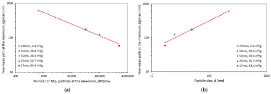In Equation (1), and represent the particle’s density and diameter, respectively. For TiO2, the density considered was 4.23 g/cm3 [].
