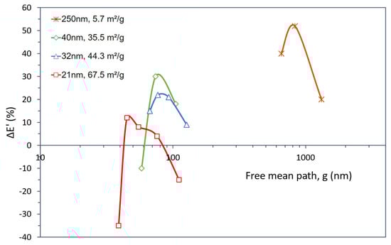 Thus, it is desirable to find an alternative way to access the property’s underlying mechanism. When the property gain is plotted as a function of g (Figure 6), a trend similar to that for NP can be observed, i.e., the distance among larger particles (with a lower SSA) for the best property improvement is higher than that for smaller particles (with a higher SSA).