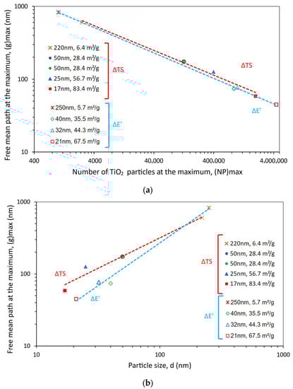 Comparison of relative changes in tensile strength (ΔTS) for TiO2-epoxy nanocomposites as a function of particle size and added particle content (particle number (NP), mean free path (g) and specific surface area (SSA) were calculated).