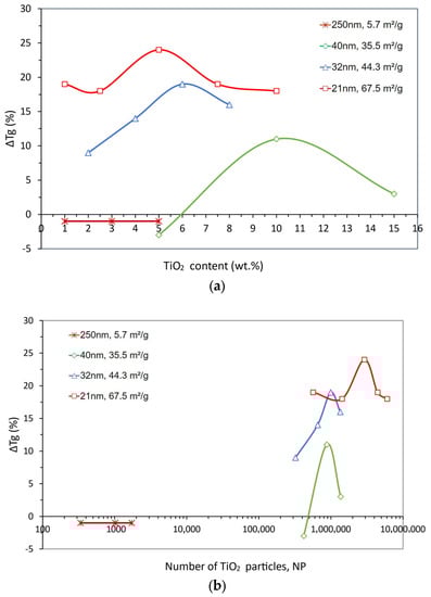 The titania (TiO2) particles are, indeed, the most commonly used particles found in the literature, with more abundant data and several industrial applications. Similarly, epoxy DGEBA is the most common polymeric matrix considered in these studies, given its wide usage in industry, easy access to and ability to disperse particles within low-viscosity media [].