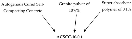 To distinguish the concrete mixtures, the samples were properly labeled. The autogenous cured self-compacting concrete (ACSCC-X-Y) design mixture with GP content of X% and SAP content of Y% is referred to in this article. A sample labeling for ACSCC-10-0.1, for instance, is given below (Figure 2)