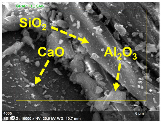 Cement, fly ash, and GP samples’ morphology was examined using SEM-EDAX. The picture in Figure 3 at a scale of 6 micrometers (µm) was created through testing and demonstrates the extremely changeable size of GP particles. The GP particles’ surfaces were angular, irregular, and had a high degree of surface roughness. The results of GP in Figure 3 reveal a high concentration of silica, calcium, and alumina, all of which support pozzolanic activity.