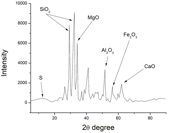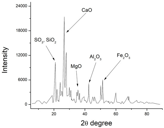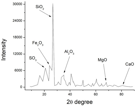 Match Crystal Impact software was used to help evaluate the XRD patterns, as shown in Figure 6, Figure 7 and Figure 8, and the chemical characteristics of GP, fly ash, and cement were examined. The research verified the presence of calcium oxide, iron, silica, and alumina concentration in fly ash and GP. Fly ash contained a significant amount of quartz (SiO2) (52.6 percent). The second most abundant mineral in the fly ash was alumina (Al2O3), which made up 38.4 percent of the total. Similarly, the largest percentage (50.3%) of silicon dioxide (SiO2) was identified in GP, which was also present in fly ash.