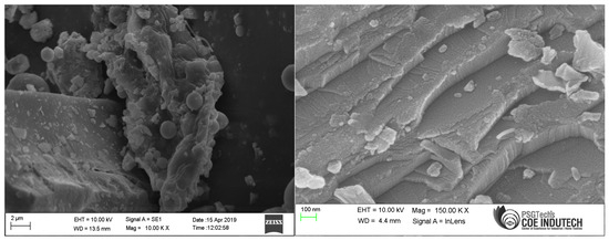 The images in Figure 9, Figure 10 and Figure 11 show the particle distribution for fly ash, GP, and cement specimens at a size of 100 nm. According to IS 3812-2003 [32], the three oxides added together (ferric oxide (Fe2O3), alumina (Al2O3), and silica (SiO2)) should be greater than 70% in order for natural pozzolans to qualify as Class N natural pozzolans that have been calcined and are suitable for employing in the blend. The existence of silica, ferric oxide, and aluminum oxide meets the prerequisites, as XRD studies have verified. GP can be used as a cement alternative according to the chemical and microstructural examinations. The conclusion implies that the primary morphological patterns are rather widespread in cement and GP samples.