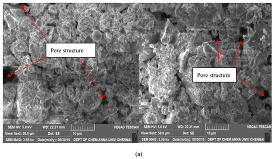 Because the quantity of water in concrete impacts how the microstructure develops and hardens, the water kinetics in specimens with SAPs are crucial to understanding the microstructural features and the moist mechanisms involved. The microstructural evolution of a mixture is determined by its hydration. Pastes with SAPs have more capillary porosity if additional water is added in order to account for the decreased workability [42]. The control specimen’s microstructure can be seen in the images at 10 and 50 µm scales in Figure 12a. There are more visible pore structures with relatively large diameter and less homogeneity in this image. This is because of the weak surface hydration response and less interface interactions within the concrete matrix. The microstructure of ACSCC-10-0.4 and ACSCC-15-0.3 at 10 and 50 µm scales is given in Figure 12b,c which shows they are the most homogenous of all the GP-ACSCC mixtures. In the image, the gel formed from calcium silica hydration (C-S-H) is more visible. It is clear that the GP-ACSCC combination concrete is tightly packed, homogenous, and has lesser pore structures in comparison to the control specimen, leading to a stronger water retention property and lower shrinkage, as illustrated in Figure 12b,c. Beyond 0.6% of SAP, the void increases and thus lowers the homogeneity of the concrete, as demonstrated in Figure 12d. According to the findings of B. Craeye et al. [43], SAP addition is responsible for the homogeneity in GP-ACSCC combinations. B. Craeye et al. [43] claimed that adding SAP to concrete initially promotes the emergence of pore structures, but it also hastens the hydration process by supplying internal water and helps form the hydrated product, which fills the pores.