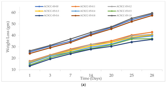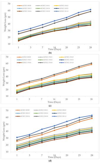 Weight loss of GP-ACSCC mixtures with time. (a) 5% GP, (b) 10% GP, (c) 15% GP, and (d) 20% GP.
