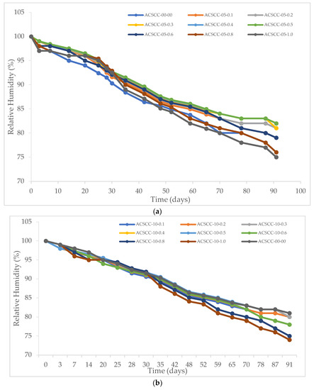 - A significant increase in relative humidity was noticed for 91 days compared to the conventional mixture for almost all GP-ACSCC mixtures.