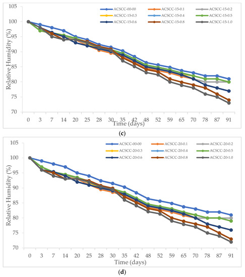 Internal relative humidity of GP-ACSCC mixtures with time. (a) 5% GP, (b) 10% GP, (c) 15% GP, and (d) 20% GP.