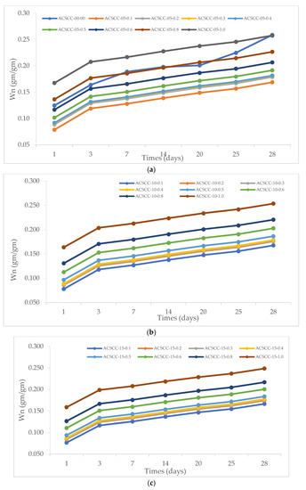 As per the guidelines of ASTM C1585 [50], the sorptivity value obtained for most of the GP-ACSCC combinations was classified as “very good” and “good”. This shows that GP-ACSCC mixtures have poorer pores. It is evident from Figure 16 that the majority of the GP-ACSCC blends fell in the “very good” and “good” criteria; however, the introduction of SAP beyond 0.5 percent accelerated the sorptivity value, which fell in the “poor” criteria as per ASTM C1585 [50]. Among all the 32 GP-ACSCC blends, two mixtures (ACSCC-05-0.1 and ACSCC-15-0.1) had the lowest sorptivity values (Figure 16).