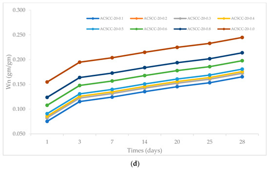 It was discovered that the GP-ACSCC blends lost less weight over time as a result of moisture evaporation than the traditional mixtures. This suggests that GP-ACSCC mixtures retain water more effectively. Figure 13 depicts the weight decrease over time for each blend. In comparison to concrete mixtures with SAP, weight loss for concrete mixtures without SAP was larger. Furthermore, GP-ACSCC blends with addition of SAP above 0.6% lost weight more quickly than those with SAP additions below 0.6%. Figure 13 makes it obvious that the weight loss of the specimens decreases as GP and SAP content increases, demonstrating that water retention increases with the addition of a high percentage of GP and SAP to GP-ACSCC blends.
