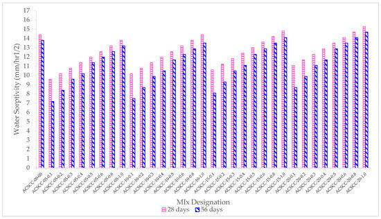 Concrete’s sorptivity was examined at 28 and 56 days to see how self-curing affects the formation of capillary holes and water suction. Table 3 and Figure 16 show the sorptivity for regular concrete and GP-ACSCC mixtures under two different curing regimes at 28 and 56 days of age. At both ages, for the consistently water-cured state, it was discovered that the normal concrete mixture without SAP had higher water sorptivity values. It was evident from the findings that the GP-ACSCC blends had higher water sorptivity values than the water-cured standard mixture. This supports the findings for other water retention kinetics properties. The sorptivity values of both the GP-ACSCC blends and the water-cured concrete mixtures were observed to decrease over time, but the drop for the water-cured mixture was greater than that for the GP-ACSCC blends. This may be explained by the continued hydration in both mixtures; however, in the case of GP-ACSCC blends, the effect was insignificant in reducing the volume of enormous pores. The decreased pace of hydration may be to blame for this.