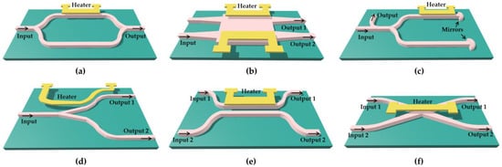 Various structures of thermo-optic devices. (a) Device with MZI, (b) device with MMI, (c) device with MI, (d) device with Y-branch, (e) device with directional coupler, and (f) device based on TIR.
