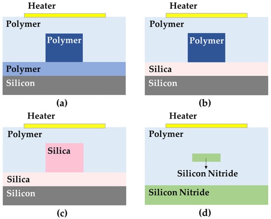 In terms of materials, with a thermo-optical coefficient of ~−10−4 K−1 and low thermal conductivity, optical polymer materials are a desirable choice for low-power thermo-optic devices. Its use is currently the subject of extensive research and rapid development [,,,]. The cross-section of the all-polymer thermo-optic switch is shown in Figure 2a. Xibin Wang et al. proposed a low-power 1 × 2 polymer thermo-optic switch that can operate in the 650 nm short-distance communication window []. The team used the advantage of an adjustable refractive index in polymer synthesis to synthesize a stable cross-linkable polymer P(MMA-GMA) by the copolymerization of methylmethacrylate (MMA) and glycidyl methacrylate (GMA). The spectral absorption test indicated that the P(MMA-GMA) material system has a low-loss window of approximately 650 nm. The extinction ratio of the device at a 650 nm signal wavelength was greater than 23.4 dB, with a power consumption of only 5.3 mW. The rise time and fall time of the device were 464.4 µs and 448.0 µs, respectively. Whereas inorganic materials have a large thermal conductivity, polymers have a large thermo-optic coefficient. Consequently, organic/inorganic hybrid integrated devices can combine the advantages of both materials and produce thermo-optic switches with a low power consumption and fast response [,,,,]. The thermo-optic switch cross-section of the hybrid integrated structure is shown in Figure 2b. Yunfei Yan et al. reported a thermo-optic switch that employed polymer as the core layer and upper cladding layer and silica as the lower cladding layer []. By using silica instead of polymer as the lower cladding layer, the switching time of the device was reduced by 40% compared with the all-polymer structure of the thermo-optic switch. At a driving power of 7.2 mW, the rise time and fall time of the switch were 106 µs and 93 µs, respectively. Another hybrid integrated structure using an inorganic material as the core layer and a polymer as the cladding was also investigated. In 2022, a thermo-optic switch with silica as the core layer and polymer as the cladding was demonstrated []. A cross-sectional view of the switch is depicted in Figure 2c. The width of the core in the heating region was reduced so that the optical field is located more on the polymer cladding, enabling more efficient thermal tuning. The simulation results show that the power consumption of the hybrid integrated structure is about 95% lower than that of the all-silica structure. This structure retains the low-loss characteristics of silica while taking advantage of the large thermo-optical coefficient of the polymer to reduce power consumption and is expected to be used in optical communications. Recently, the silicon nitride platform has gained significant attention due to its low transmission loss from visible to mid-infrared wavelengths, compatibility with CMOS processes, and high refractive index [,,,]. Although the thermo-optic coefficient of silicon nitride is not high, it has a good compatibility with polymeric materials. The power consumption of the thermo-optic switch using silicon nitride waveguides can be reduced by taking advantage of the large thermo-optic coefficient of polymers and the simplicity of fabrication. In 2023, Xinhong Jiang et al. proposed a thermo-optic switch with a thin silicon nitride waveguide embedded in a polymer cladding []. The material distribution is shown in Figure 2d. Since a large portion of the optical field is located on the polymer cladding, the waveguide can be thermally tuned efficiently.