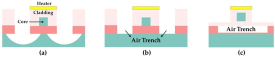 In terms of the waveguide structure, air trenches are often introduced to prevent heat diffusion for the purpose of reducing power consumption [,]. The thermal conductivity of air at room temperature is ~0.025 W/mK, whereas that of polymers is 0.1–0.3 W/mK. Consequently, the most common approach is to leverage the low thermal conductivity of air by etching the air trench at the bottom or side of the heating arm, as shown in Figure 3. In 2017, Sun Shiqi et al. etched air trenches on both sides of the waveguide core []. The power consumption of the thermo-optic VOAs was reduced from 8.71 mW to 2.80 mW. In 2022, Long Zhang et al. discussed the effect of the device structure on the core layer temperature by simulating the temperature field of the heated waveguide []. The data showed that the presence of bilateral air trenches increased the core layer temperature of conventional rectangular waveguides by about 52.6%. In 2021, Kai Chen et al. used the structure of a laterally supported suspended ridge waveguide (LSSRW) combined with a bottom air trench for a thermo-optic switch []. This suspended structure is also applicable to polymer-based thermo-optic devices, but structural stability issues need to be considered.