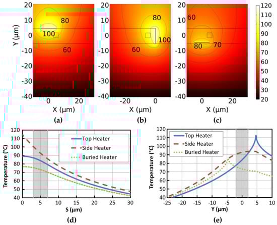 Cross sections of the thermal distribution of the waveguides with (a) the top heater, (b) the side heater, and (c) the buried heater. (d) Comparisons of the temperature gradients along the X-axis in the waveguide center. (e) Comparisons of the temperature gradients along the Y-axis in the waveguide center. Reprinted with permission from []. © Optical Society of America (2015).