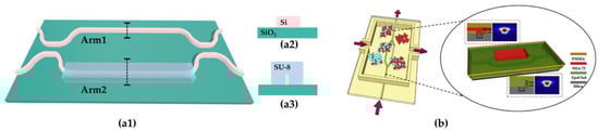 (a1) A diagram of the MZI-based temperature sensor with silicon/SU-8 hybrid waveguides. The cross sections of (a2) arm1 and (a3) arm2. (b) A schematic diagram of a temperature sensor integrated into a microfluidic system (reprinted from [], with permission from Elsevier).
