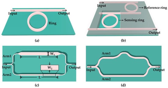 (a) A three-dimensional diagram of an MRR structure. (b) A three-dimensional diagram of the CRR temperature sensor. (c) A schematic of the asymmetric MZI temperature sensor with two waveguide arms of different widths. (d) A schematic of the asymmetric MZI temperature sensor with two waveguide arms of different lengths.