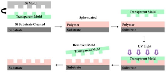 Photolithography with exposed masks is a traditional polymer waveguide fabrication process. The process steps combined with wet etching are shown in Figure 9. First, the polymer is spin-coated on the cleaned and dried substrate, and the lower cladding is formed after ultraviolet (UV) curing. Next, the core layer is spin-coated, UV photo-etched using a mask, and post-baked. Then, the developer is used to clean the graphics and fabricate the waveguide core. The upper cladding is fabricated on the core layer by spin-coating. Finally, the whole device is UV-cured or heated. Wet etching has the advantages of high production efficiency and simple equipment, but it also produces chemical liquid waste. The preparation of polymer devices can also be achieved by dry etching, including reactive ion etching (RIE) and inductively coupled plasma (ICP) etching. The device fabrication process using ICP etching is shown in Figure 10. Dry etching has the advantages of high controllability and no chemical waste. However, the cost of dry etching is high, and the equipment is complex.