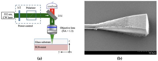 - Wu, Z.L.; Qi, Y.N.; Yin, X.J.; Yang, X.; Chen, C.M.; Yu, J.Y.; Yu, J.C.; Lin, Y.M.; Hui, F.; Liu, P.L.; et al. Polymer-Based Device Fabrication and Applications Using Direct Laser Writing Technology. Polymers 2019, 11, 553. [Google Scholar] [CrossRef] [PubMed]