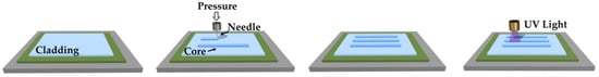 - Lin, C.; Jia, X.; Chen, C.; Yang, C.; Li, X.; Shao, M.; Yu, Y.; Zhang, Z. Direct ink writing 3D-printed optical waveguides for multi-layer interconnect. Opt. Express 2023, 31, 11913–11922. [Google Scholar] [CrossRef] [PubMed]