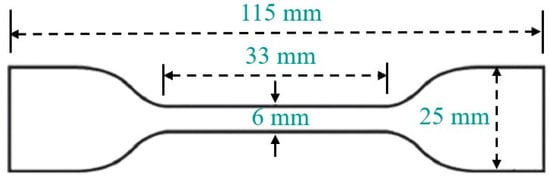 A dumbbell shape was made, as shown in Figure 1. Then, the NBRs were irradiated by 60Co γ-rays; the irradiation was conducted with an FJ × 424 60Co γ-rays irradiation device from the Sichuan Institute of Atomic Energy (Chengdu, China), with the irradiation amount of 50 KGy/h. The samples were taken out from the irradiation device when the cumulative amount reached 10 KGy, 100 KGy, 1 MGy, 2 MGy, 3 MGy, 4 MGy, and 5 MGy, respectively. These samples were named NBR76-0, NBR76-1, NBR76-2, NBR76-3, NBR76-4, NBR76-5, NBR76-6, and NBR76-7, respectively.