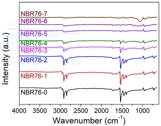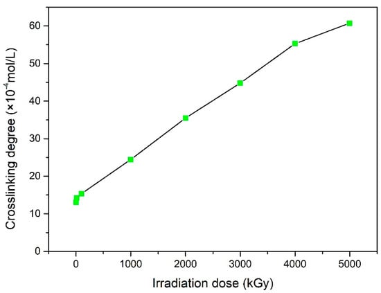 Figure 2 shows the change in the cross-linking degree between the samples before and after irradiation. When gamma-irradiated, NBR rubber undergoes a cross-linking reaction due to the increased dose of the total irradiation. Over the entire dose range studied, the cross-link density increased, in part due to the increased intermolecular radical–radical combinations and other rearrangements, which indicated the cross-linking behavior of the NBR polymers during irradiation [33].