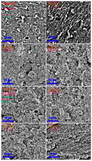 The cross-sectional morphology of the tensile NBR sample after different γ-ray irradiation amounts is shown in Figure 4. Compared with the unirradiated samples, gamma irradiation caused pores and cracks to appear on the NBR materials [18], and the fracture surfaces appeared deformed and morphologically rough, with numerous low ridges. The possible reason for this phenomenon was that γ-rays caused cross-linking reactions between the molecular chains, the relative molecular mass, and destroyed the microstructure of the polymer materials. After exposure to a total dose of 1 MGy, the irradiated surfaces exhibited lamellar fracture planes and small voids or pits. Due to the high gamma irradiation, the number of cavities or vacuoles and fracture morphology increased. It appeared that the cross-linking reaction dominated, though both crosslinking and degradation co−existed. Usually, they occur simultaneously, and one of them may be dominant, depending on the chemical structure and irradiation conditions such as the environment, dose rate, and temperature [34].