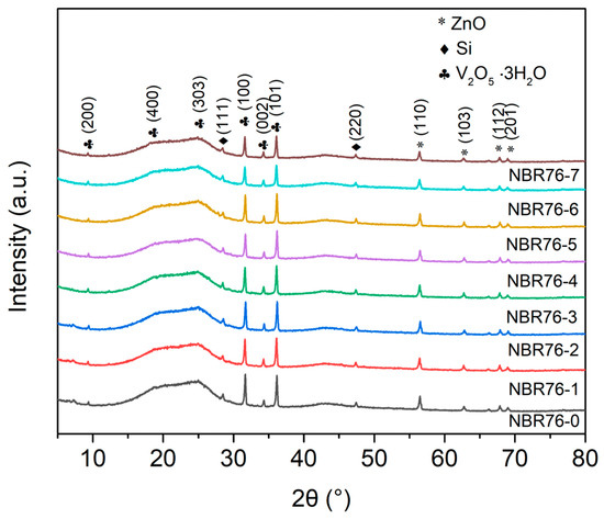Figure 5 shows the XRD patterns of the NBR with different γ-ray irradiation doses. The diffraction peaks were observed at 9.4°, 20.3°, 25.0°, 31.7°, and 36.2°, corresponding to the (200), (400), (303), (100), and (101) crystal planes of V2O·3H2O, respectively. The diffraction peaks positioned at 56.5°, 62.8°, 68.1°, and 70.3° corresponded to the (110), (103), (112), and (201) crystal planes of ZnO, respectively, while the peaks at 28.5°, 47.5°, and 34.3° corresponded to the (111), (220), and (002) crystal planes of Si, respectively. The diffraction signals of these crystals may have come from the additives of NBR.