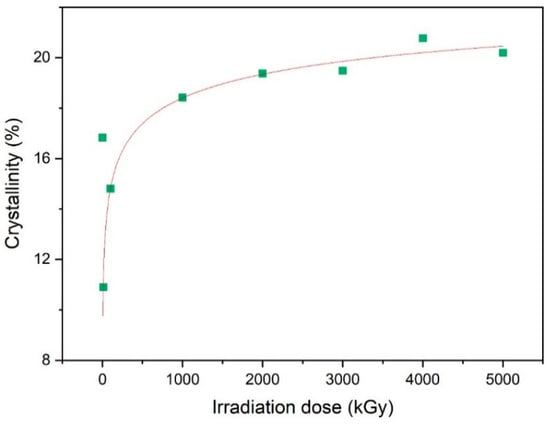 Figure 6 shows that, on the whole, the crystallinity of the NBR materials increased with an increase in the γ-ray irradiation dose. We suspect that the cross-linking caused by the irradiation occurred primarily in the amorphous region, and the edge crystal region adjacent to the amorphous region experienced grafting due to its looser molecular configuration, resulting in a less amorphous material and more crystallinity. We employed mathematical methods to fit a function model describing the relationship between the crystallinity of the NBR polymer and the radiation dose. The resulting model was found to be Lognormal CDF (Equation (3)), where y0 is 0.6685, A is 24.1851, and adjusted R-square is 0.9850.