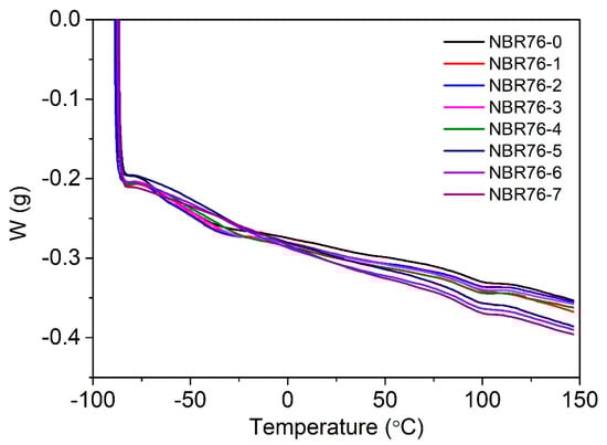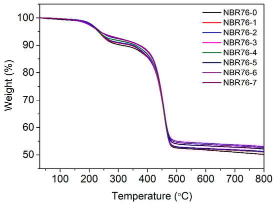 The TGA curves of the NBR with different γ-ray irradiation doses are shown in Figure 8. It was found that NBR76 began to decompose at 200 °C, the decomposition rate increased at 250 °C and reached its highest decomposition rate at 400 °C, and the decomposition ended at 475 °C, with a weight loss rate of over 50%. Rubber carbonization occurred as the total irradiation dose increased, and the carbonization rate increased. The residual carbon rate increased as the cross-linking density increased [35]. Meanwhile, the temperature increase from 10% degradation further indicated that γ irradiation promoted a cross-linking reaction.