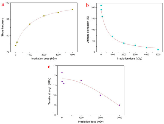 Mechanical properties of NBR with different γ-ray irradiation doses, (a) hardness, (b) ultimate elongation, and (c) tensile strength.