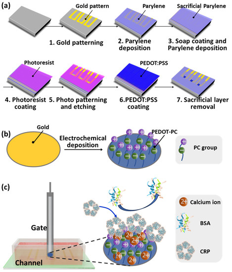 - Goda, T.; Toya, M.; Matsumoto, A.; Miyahara, Y. Poly(3,4-ethylenedioxythiophene) Bearing Phosphorylcholine Groups for Metal-Free, Antibody-Free, and Low-Impedance Biosensors Specific for C-Reactive Protein. ACS Appl. Mater. Interfaces 2015, 7, 27440–27448. [Google Scholar] [CrossRef] [PubMed]