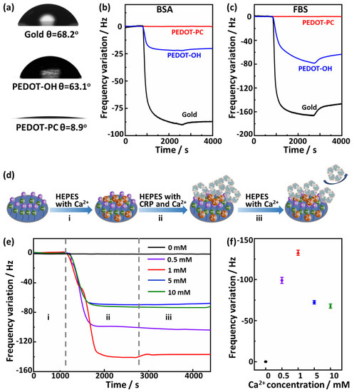 (a) Water contact angles of gold, PEDOT-OH, and PEDOT-PC. (b,c) Adsorption of proteins (BSA and FBS) to gold, PEDOT-OH, and PEDOT-PC. (d) A schematic diagram of QCM test process for CRP binding on PEDOT-PC surface. (e) Frequency variation in CRP (4 μg/mL) binding on PEDOT-PC films in HEPES buffer with different concentrations of Ca2+ ions. (f) Quantized frequency variation in CRP binding on PEDOT-PC films in HEPES buffer with different concentrations of Ca2+ ions.