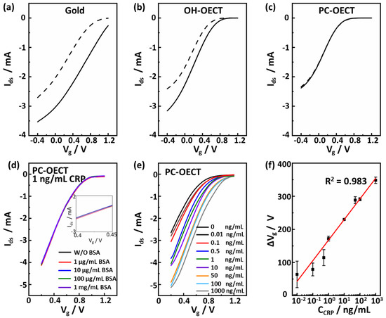 (a–c) Transfer curves of gold, OH-OECT, and PC-OECT in HEPES buffer before (solid line) and after (dash line) BSA solution soaking for 30 min. (d) Transfer curves of the PC-OECT in 1 ng/mL CRP HEPES (Ca2+) buffer with different concentrations of BSA interference. (e) Transfer curves of the PC-OECT with different CRP concentrations in HEPES (Ca2+) buffer. (f) The gate voltage offset for the PC-OECT after CRP binding with different CRP concentrations. Red line is the fitting line of the voltage offset.