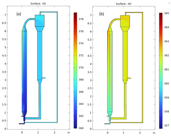 Temperature distribution profile throughout the MZCR (a) without a cooler, (b) with cooler insertion in the riser (b).